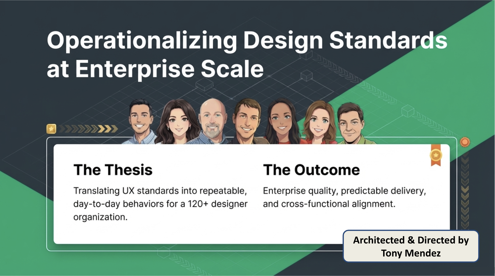 This presentation is a case study in systems architecture, detailing the systematic translation of high-level UX principles into a unified 'Way of Working' for an organization of 160+ practitioners.